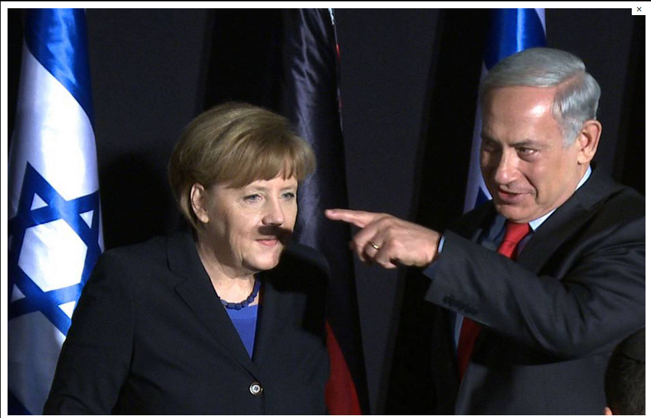 A sombra do dedo de Netanyahu coloca um sinistro bigode na cara de Angela Merkel, de forma muito parecida com o de Adolf Hitler.